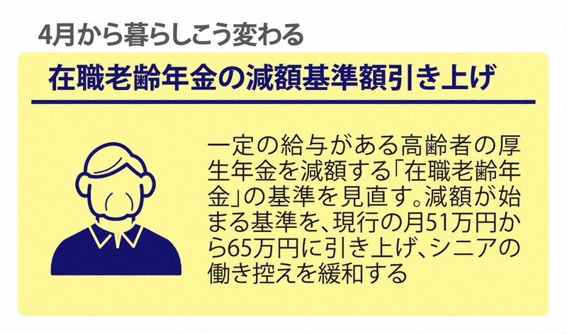 また、一定の給与がある高齢者の厚生年金を減額する「在職老齢年金」の基準を見直し、減額が始まる基準を、現行の月51万円から65万円に引き上げます。人手不足で、シニア層の働き控えになるとの指摘があり、減額されにくくなることで働き控えを緩和する狙いがあります。【近森歌音、斎藤文太郎、深津誠、井口彩】