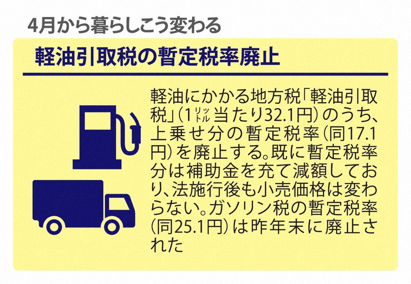 軽油にかかる地方税「軽油引取税」(1リットル当たり32・1円)のうち、上乗せ分の暫定税率(同17・1円)が廃止されます。既に暫定税率分は補助金を充て減額しており、法施行後も小売価格は変わりません。ガソリン税の暫定税率(同25・1円)は昨年末に廃止されています。