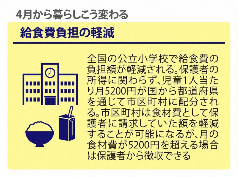 全国の公立小学校で給食費の負担額が軽減されます。保護者の所得に関わらず、児童1人当たり月5200円が国から都道府県を通じて市区町村に配分され、市区町村は食材費として保護者に請求していた額を軽減することが可能に。月の食材費が5200円を超える場合は保護者から徴収できます。