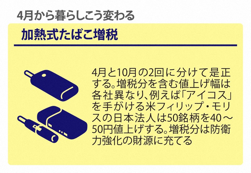 加熱式たばこが増税されます。紙巻きたばこと比べて税額の占める割合が1~3割ほど低かったため、4月と10月の2回に分けて是正し、増税分は防衛力強化の財源に充てられます。増税分を含む値上げ幅は各社異なり、例えば「アイコス」を手がける米フィリップ・モリスの日本法人は、50銘柄を40~50円値上げします。