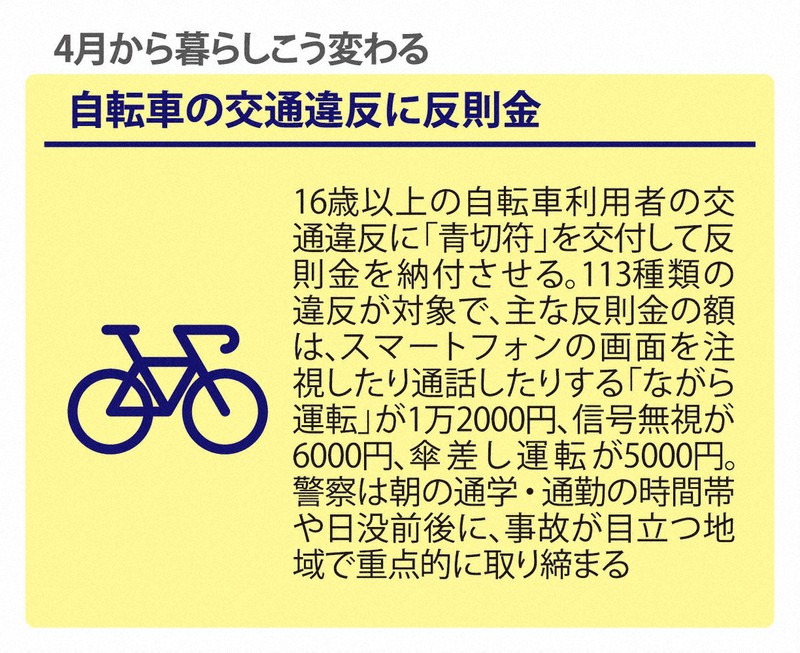 4月から暮らしに関わる制度や仕組みが変わります。少子化対策の財源となる「子ども・子育て支援金」の徴収が始まり、自転車で交通違反をした場合、反則金が科せられることになります。一方で、私立高校の授業料が実質無償化され、公立小学校での給食費負担も軽減されます。主なものをまとめました。