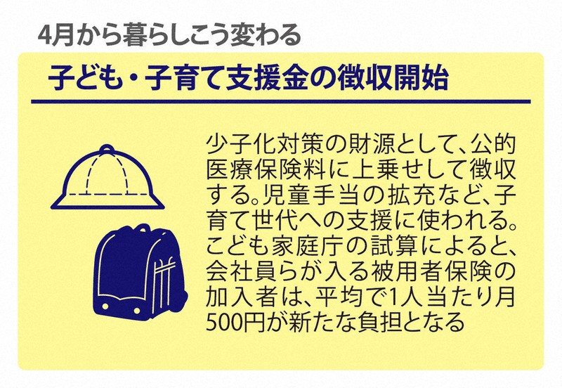 子ども・子育て支援金は、少子化対策の財源として、公的医療保険料に上乗せして徴収され、児童手当の拡充など、子育て世代への支援に使われます。こども家庭庁の試算によると、会社員らが入る被用者保険の加入者は、平均で1人当たり月500円が新たな負担になります。