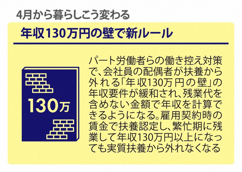 パート労働者らの働き控え対策で、会社員の配偶者が扶養から外れる「年収130万円の壁」の年収要件が緩和され、残業代を含めない金額で年収を計算できるようになります。雇用契約時の賃金で扶養認定し、繁忙期に残業して年収130万円以上になっても実質扶養から外れなくなります。