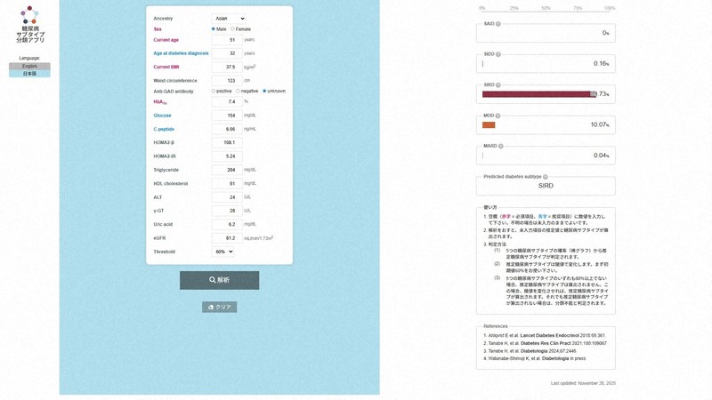 同アプリはパソコンやスマートフォンで使うことができる。年齢や血糖値、体格指数(BMI)などのデータを入力すると、患者がどの型に当てはまるか10秒前後で表示される。型の違いによって将来の透析導入リスクが違うことが分かっており、従来はひとくくりにされがちだった2型糖尿病を細分化し、病態の違いを踏まえた予測を可能にした。