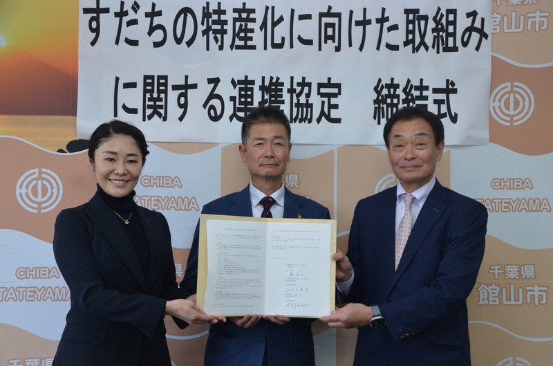 千葉県館山市でスダチを特産品にしようという取り組みが始まった。3月26日にはモデル農園に徳島県産の苗木を植樹。添え物としてスダチが欠かせないフグ料理専門店と市、栽培業者が連携協定を結び、生産技術の普及や規格外品の活用、「館山すだち」のブランド化などを進めていくことになった。