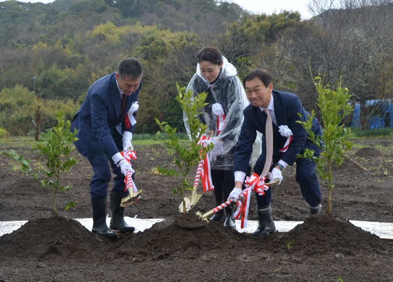 モデル農園は館山市上真倉にあり広さ約1500平方メートル。今年は徳島県産の苗約40本を植えるという。来年以降苗木を増やしていき3~4年後に初出荷、10年後には年間10トンの収穫を目指す。