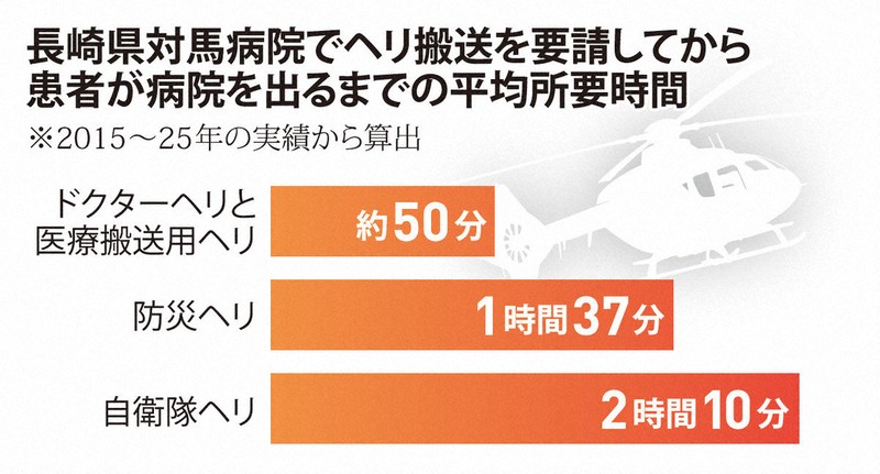 対馬病院によると、ヘリ搬送を要請してから同病院を患者が出るまでの平均所要時間(15~25年の実績から算出)はドクターヘリや和白病院の医療搬送用ヘリが約50分であるのに対し、防災ヘリは1時間37分で倍近くかかる。ドクターヘリも防災ヘリも使えない場合は自衛隊ヘリに依頼するが、県知事による災害派遣要請の扱いとなり手続きに段階を踏むため、平均所要時間は2時間10分とさらに延びる。