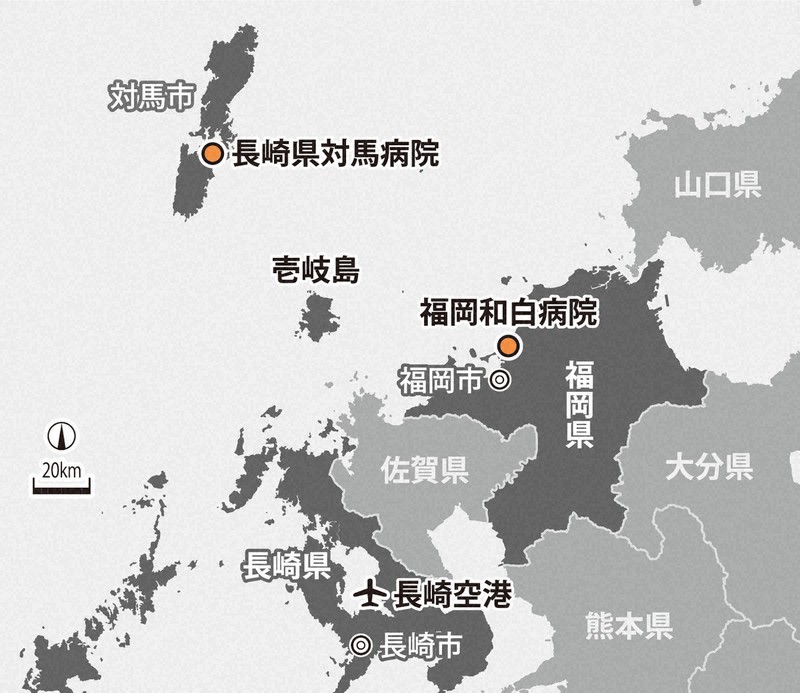 対馬市は長崎県の自治体ながら、生活圏としてはフェリーなどで結ばれる福岡と関係性が深い。和白病院では08年に民間として医療搬送用ヘリを独自に導入し、対馬や壱岐から患者を搬送。国と都道府県の負担で運営するドクターヘリが主に重症患者に対応するのに比べると柔軟な運用ができ、23年度は長崎県対馬病院からのヘリ搬送のうち約半数の23件を担った。