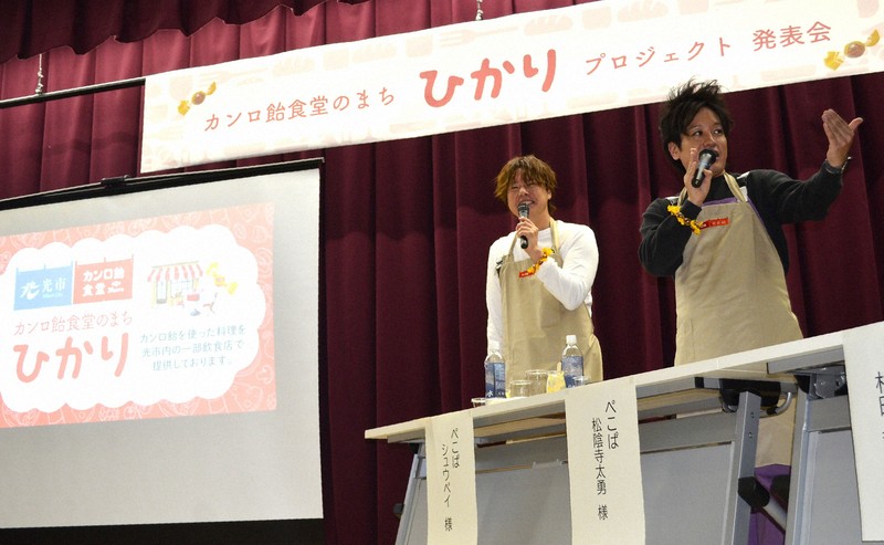 地元ゆかりの味で観光客らを呼び込む市の新規プロジェクトで、参加した事業者が提供する料理やデザートなどを披露。試食した市PR大使のお笑いコンビ「ぺこぱ」は「光り輝くカンロに感動」とアピールした。
