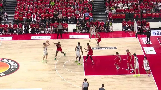 試合開始早々、Bリーグ初得点を挙げる富永選手。しかし、名古屋の執拗なマークにあい、肝心のスリーポイントシュートが決まりません。