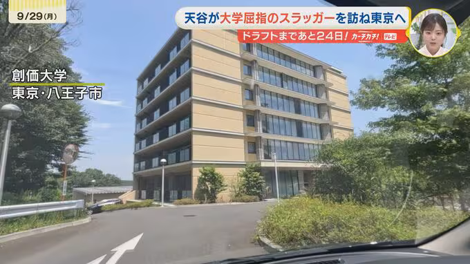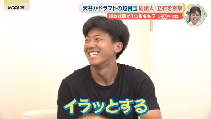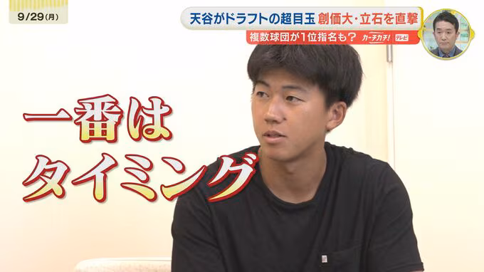 「創価大学野球部の寮にやってまいりました。今年のドラフトの目玉、立石選手に話を聞きに行きます。」