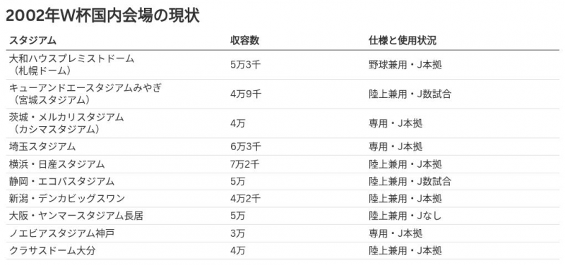共催になって会場数が少なくなったとしても、決勝や開幕戦のようなビッグゲームを呼び込みたければ8万人収容のスタジアムが必要になる。一方、開催地が都市部に集中すれば、地方にまでW杯効果を広げるという02年大会のような普及効果は薄まりかねない。