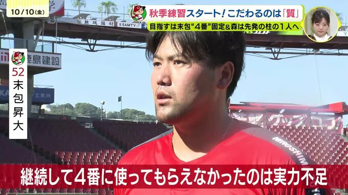 末包選手は打つだけではなくケガをしないための体作りをめざし今月からピラティスをはじめたとのこと。新しいことに取り組みながらパワーの出し方も追求していました。マツダスタジアムでの秋季練習は今月下旬まで続きその後は宮崎・日南でキャンプをおこなう予定です。