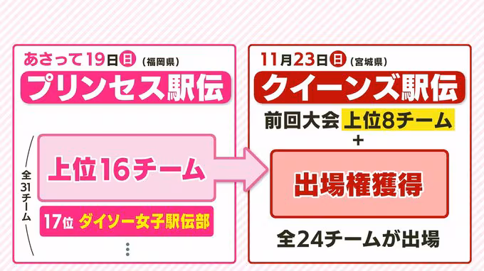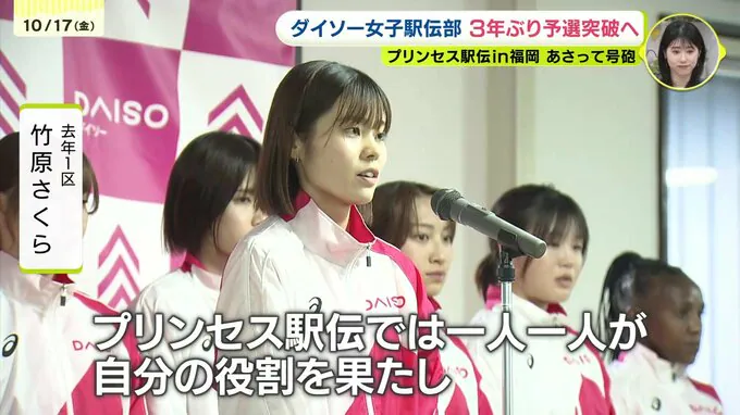 おととし4秒差、去年は36秒差で「17位」とクイーンズ駅伝に進出できる「16位」の壁を超えられず…2年連続で涙をのんだダイソー女子駅伝部。3年ぶりの予選突破へ。大事な大会を前の今月14日、オンラインふくめた全国のダイソー社員およそ300人による初めての大規模壮行会が開かれました。ステージ上で竹原さくら選手は「プリンセス駅伝では、ひとりひとりが自分の役割を果たし、チームとしての力をしっかり出し切っていきたいと思います」と語り、参加した社員は「ダイソーの会社の成長そのものみたいなものもありますので、娘のような感じもしつつ応援しています」とエールを送りました。