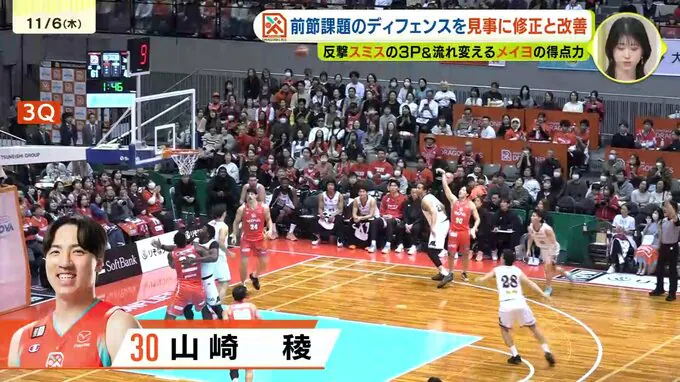 一方オフェンスは、佐藤のレイアップ。さらに山崎が今シーズン初めてホーム戦で3ポイントを沈めるなど、着実に得点を重ね、18点差と突き放します。
