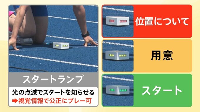 光の点滅でスタートを知らせる「スタートランプ」を使用することで、視覚情報で公正にプレーが可能になるといいます。赤は「位置について」、黄色は「用意」、緑が「スタート」を意味するそうです。