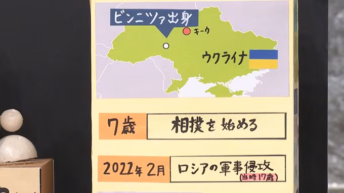 安青錦は、ウクライナ中部の町・ビンニツァ出身の21歳。相撲が人気のウクライナで7歳から相撲を始めました。2022年、ロシアの軍事侵攻を受けて18歳以上の男性の出国が制限され、当時17歳の安青錦は来日を決断します。