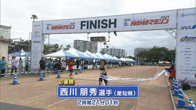 32キロを過ぎたあたりで琉球大学出身の西川朋秀が独走状態となり、2時間21分1秒でフィニッシュしました。