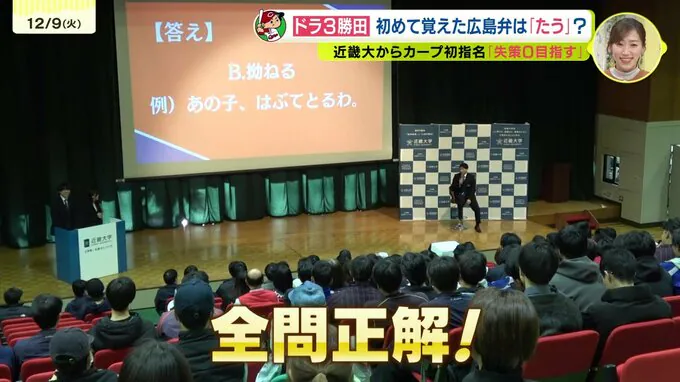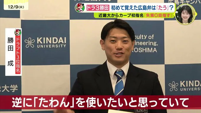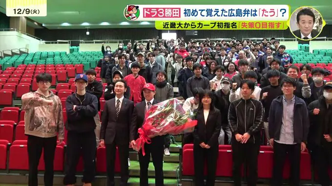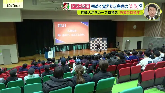 今秋のドラフト会議でカープにドラフト3位で指名された近畿大学の勝田成選手が初めて広島を訪れ、学生向けのイベントに出席しました。