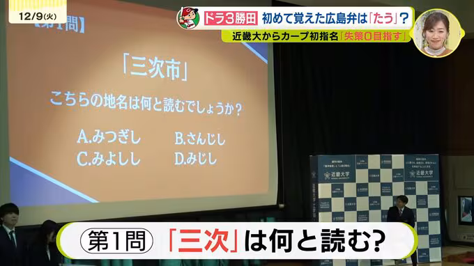 学生たちが企画したのは「広島について知ろう、勝田選手と広島クイズ」。まず出題されたのは広島の地名の読み方。