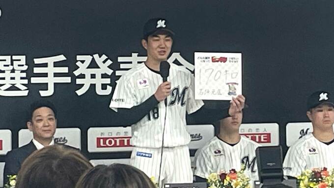 石垣は新しい背番号「18」のユニホーム姿で少し笑顔を見せて登場。サブロー監督はちらりと見て笑顔を浮かべた。袖を通し「Mの字と縦じまが良くて着心地がいい」と石垣。自己紹介としてボードに「170キロ」と書き、プロでの目標は「球団を代表するような投手になりたい」と力強く語った。