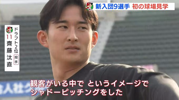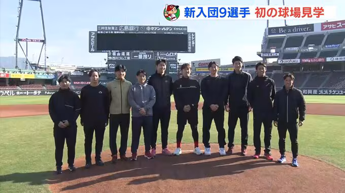 入団会見から一夜、9人のルーキーがマツダスタジアムのグラウンドに初めて足を踏み入れました。