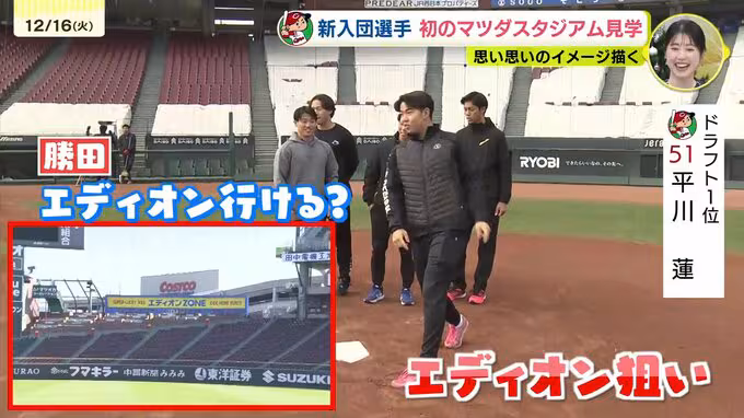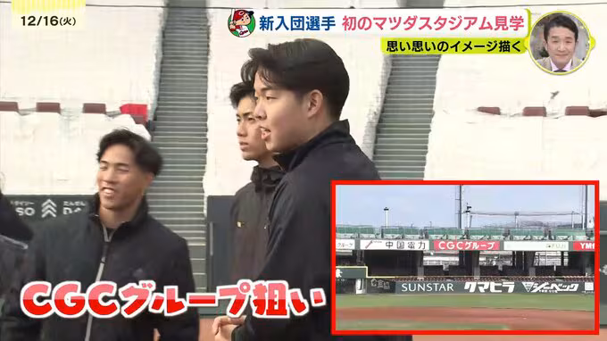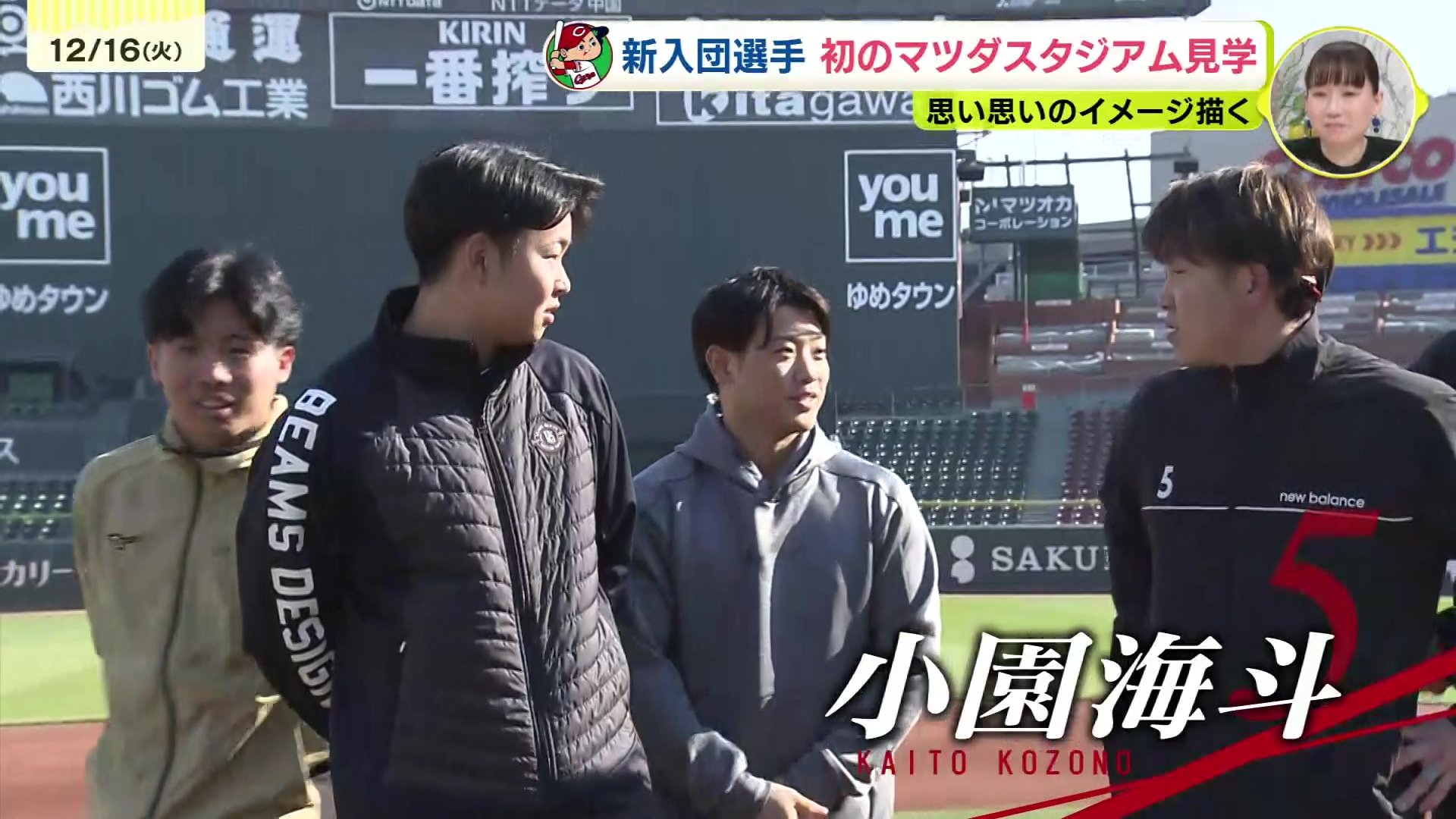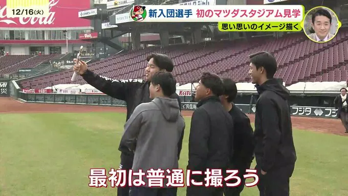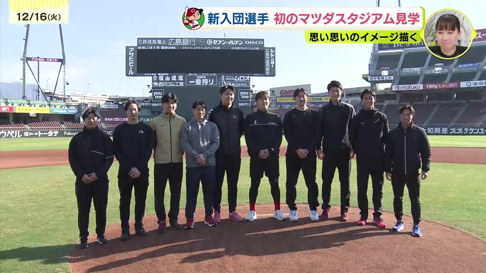 15日入団会見を終えたカープのルーキーたちが、将来の活躍の舞台となるマツダスタジアムを訪れ施設を見学しました。若鯉たちはリラックスした様子で本拠地の雰囲気を味わっていました。