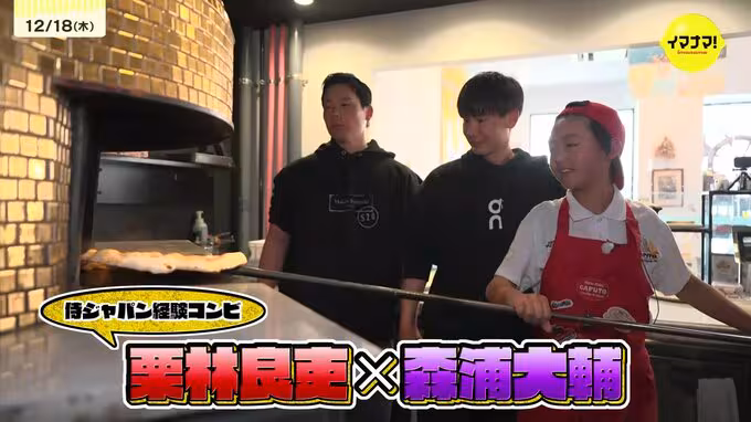 まずは、侍ジャパンで世界を相手に戦った栗林と森浦。世界一のピザ少年と初めてピザ作りに挑戦。