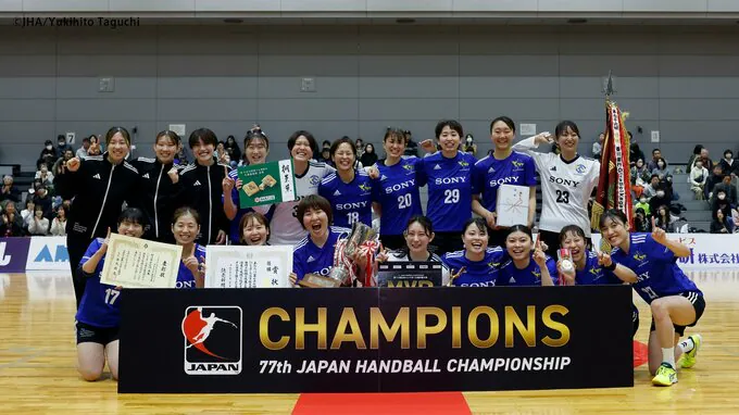 ハンドボールの日本選手権・決勝が21日、広島市のコジマホールディングス中区スポーツセンターで行われ、男子は豊田合成(名古屋)が大会6連覇で7度目の優勝、女子はソニー(鹿児島)が7年ぶり3度目の頂点に立った。