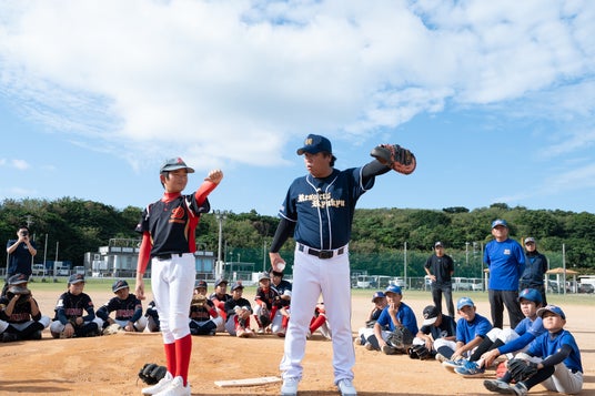 教室には、豊見城市内の少年野球チームに所属する小学6年生35名が参加。元千葉ロッテマリーンズ捕手の里崎智也さんを講師に迎え、キャッチボールやバッティング、捕手指導など、基本的な指導に加え、一人ひとりに合わせたフォームの改善も行われました。子どもたちのみならず、帯同した各チームのコーチ陣もプロの視点からのアドバイスに真剣に耳を傾け、普段の練習では得られない気づきを次々と吸収している様子でした。