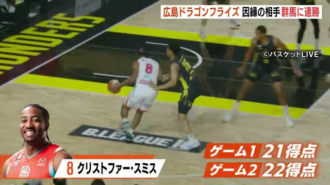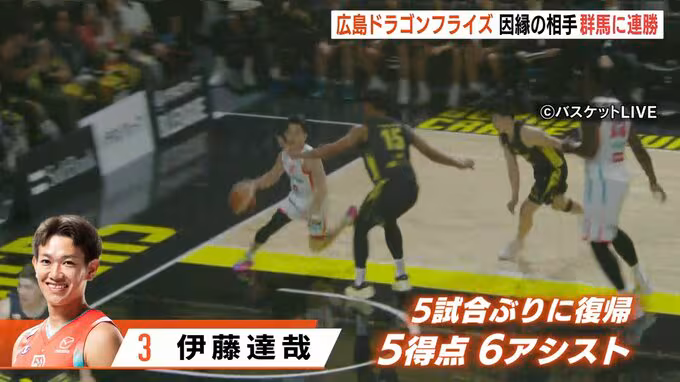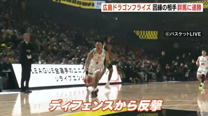 広島ドラゴンフライズは東地区4位で因縁の相手、群馬クレインサンダーズとアウェイで対戦し、連勝を決めました。