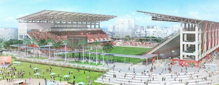 玉城デニー知事は26日の定例会見で、那覇市の奥武山公園内に整備するJリーグ規格のサッカー専用スタジアムの整備計画を公表した。観客席1万人規模のスタジアム整備費は264億円と試算。経済波及効果は年間30億~80億円を見込んでいる。2031年の供用開始を目指す。