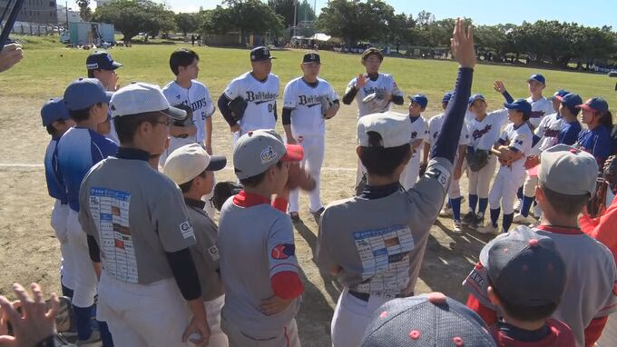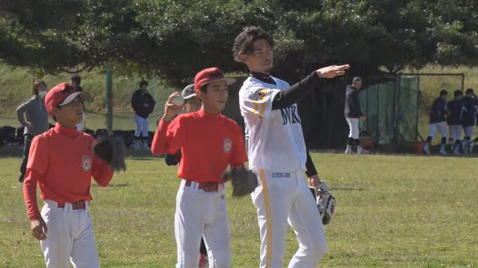 この日はおよそ100人が参加し、地元出身のオリックス・バファローズ・宮城大弥投手ら7人の選手が指導しました。