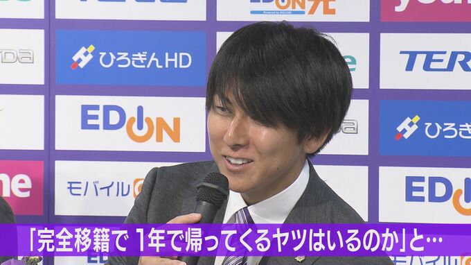 「正直、ここに(会見の椅子に)座っているのが、結構自分の中でびっくりしてるんですけど。でもその分、やっぱりやらないといけないっていう責任感を強く持って来ましたし、あとはピッチ、ピッチ外でもしっかりこのサンフレッチェ広島のために貢献できるように頑張りたいなっていう思いでいっぱいです。(チームメイトの反応は)『完全移籍で1年で帰ってくる奴はいるのか!?』と・・・それはイジられましたね(苦笑)」