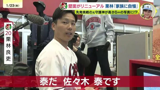 今シーズンから先発に転向するカープの栗林良吏がマツダスタジアムの正面グッズショップの壁面の写真になりました!