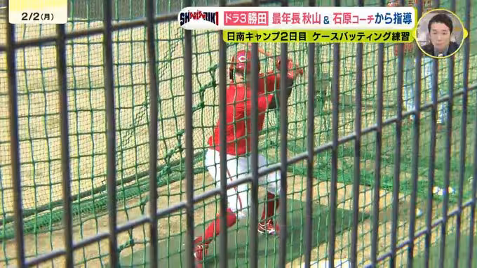 ルーキーの勝田選手が天福球場のファウルゾーンにあるバッティングゲージで行っているのは、ケースバッティング。