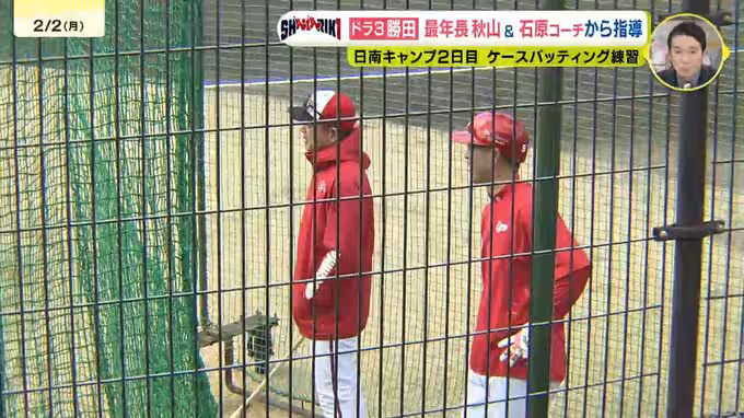 16歳上でチーム最年長・秋山翔吾選手と石原慶幸バッテリーコーチからアドバイスを受けながら、状況に応じたバッティングの難しさを感じているようでした。