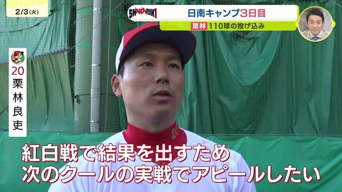 栗林はキャンプ2回目のブルペン入りです。実戦を前に少しでも早く100球を超えておきたかったと、熱のこもった投球で、110球を投げ込みました。