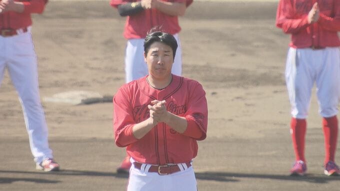 12日、カープの日南春季キャンプが最終日を迎え、石原貴規選手がキャンプ打ち上げの挨拶と「一丁締め」の大役を務めました。
