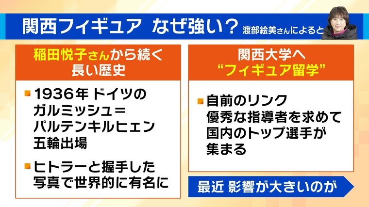 なぜ、これほどまでに関西に有力選手が集まるのでしょうか。かつて世界で活躍したプロフィギュアスケーター・渡部絵美さんによると、その背景には、大阪が生んだ伝説の選手、稲田悦子さん(1924年生まれ)から続く長い歴史があります。