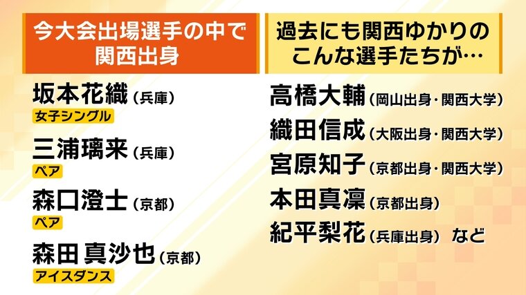 過去を振り返っても、高橋大輔さん(岡山県出身・関西大学卒)、織田信成さん(大阪府出身・関西大学卒)、宮原知子さん(京都府出身・関西大学卒)、本田真凜さん(京都府出身)、紀平梨花さん(兵庫県出身)など、層の厚さは一目瞭然です。