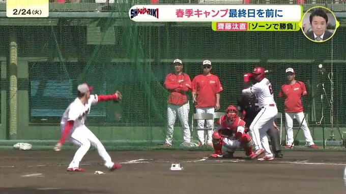最終日を前に課題に向き合っていたのがドラフト2位の齊藤汰直。オープン戦初戦に先発しましたが2回3失点と悔しい結果でした。「きょうはゾーンで勝負することしか考えなかった」とストライク先行のピッチングでした。