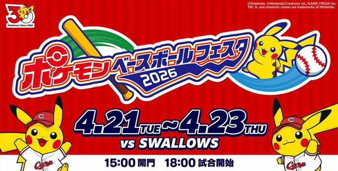 広島東洋カープは、4月21日(火)、22日(水)、23日(木)の対東京ヤクルトスワローズ戦で「ポケモンベースボールフェスタ2026 ~30周年の想いをボールに込めて~」を開催。来場者プレゼント・オリジナルグッズの販売・選手のオリジナルユニフォームの着用など、イベントが盛りだくさんの3日間です。