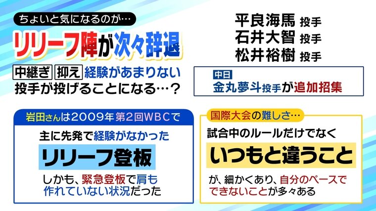 「ここは本当にみんなが心配しているところだとは思います。今のメンバーで何とかこなしていかないといけない状況。中日の金丸夢斗投手が追加召集されました。金丸投手も先発ではありますが、まだ若いので対応できるのではないかと」