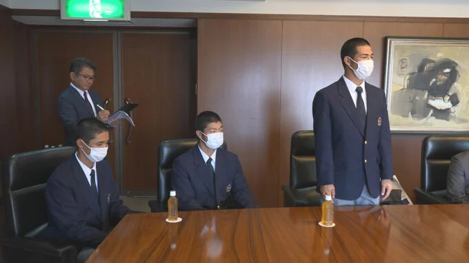 比嘉公也監督らと共に琉球放送を訪れたのは、山川大雅主将と、去年夏の甲子園で全国制覇の原動力となった左右の2枚看板、末吉良丞投手、新垣有絃投手です。山川選手らはセンバツ大会への出場を報告するとともに夏春連覇の偉業達成に向けて活躍を誓いました。