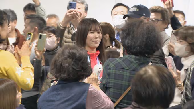 大勢の市民に出迎えられながら地元、愛知県みよし市に姿を見せた深田茉莉選手。ミラノ・コルティナオリンピックのスノーボード女子スロープスタイルで、冬季オリンピック日本女子史上最年少となる金メダルを獲得。