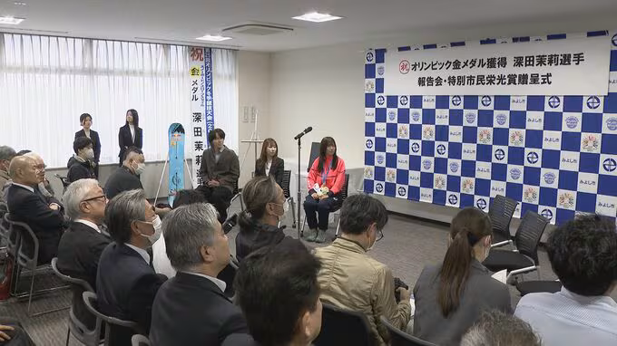 オリンピックで金メダルを獲得した、深田茉莉選手。きょう地元で4年後の金メダル獲得を宣言しました。