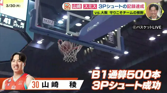 山崎はB1通算500本の3Pシュートを成功させます。