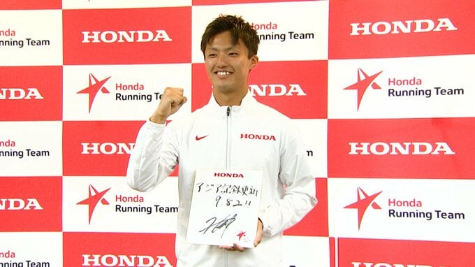 栁田選手が言っていたように、我々はレースの会社でもありますので、そういったところを最重視していき、栁田選手に加入していただいた」と話した。会見の冒頭、栁田は開口一番に「Honda陸上部43年ぶりの短距離選手として、長距離選手たちと同じく、速く走る・タイムを出すというところで先輩たちと刺激をし合いたい。今後はアジア記録更新を目標に、今のアジア記録は9秒83なので、9秒82というタイムを目指してやっていきたい」と大きな目標を記した色紙を掲げた。