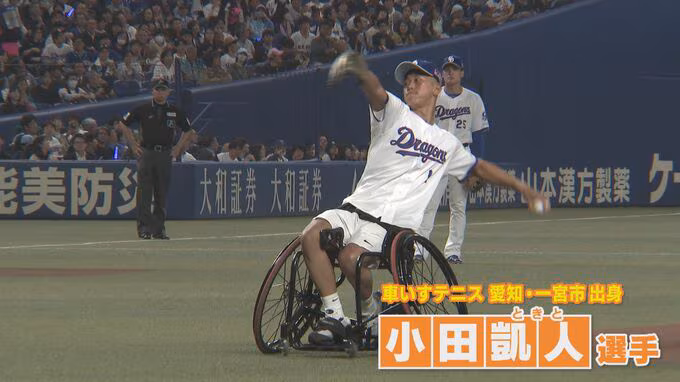 始球式は、生涯ゴールデンスラムを達成した車いすテニスの小田凱人選手が務め、力強いピッチングを披露しました。